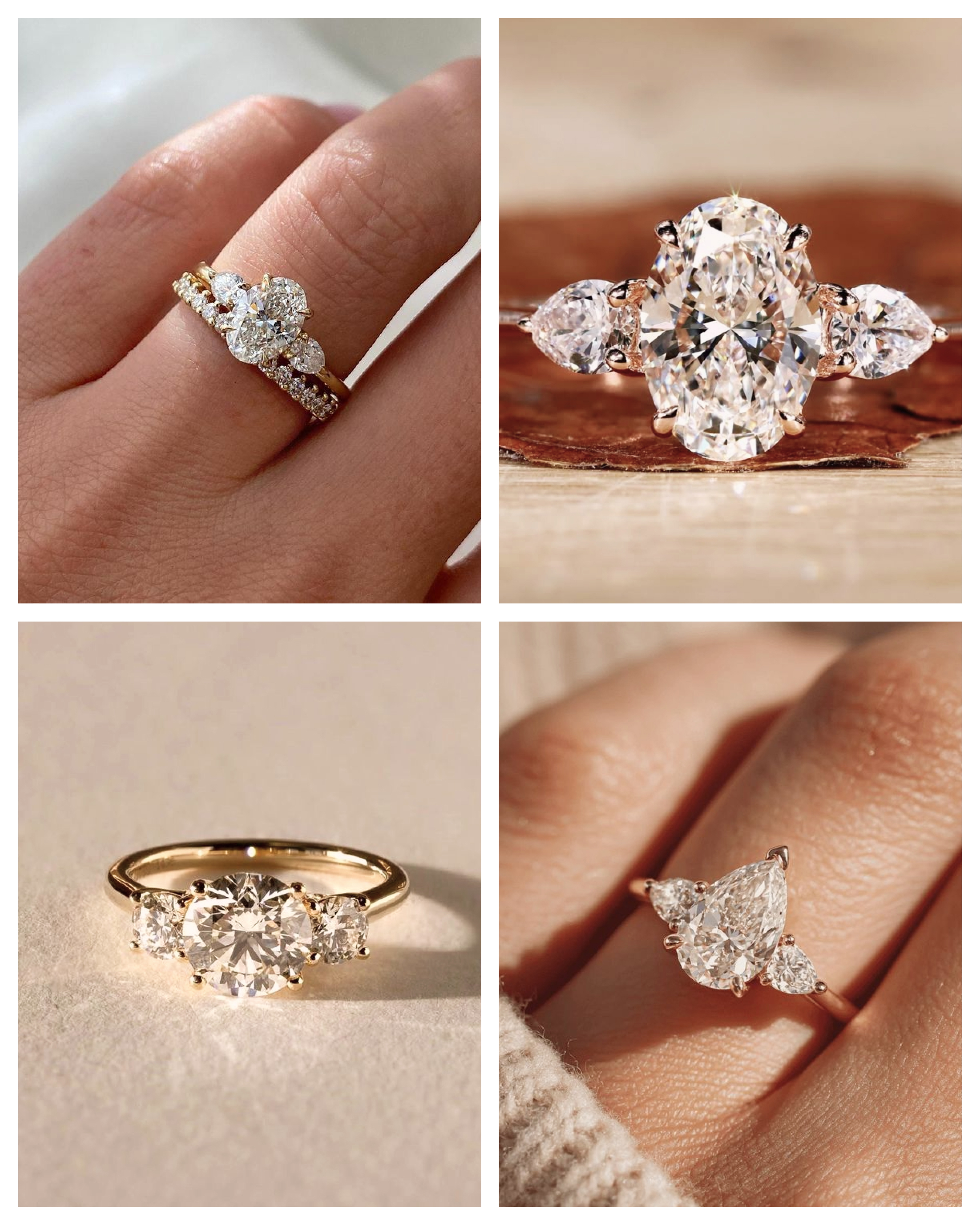Symboliczny pierścionek „przeszłość, teraźniejszość i przyszłość” otrzymuje współczesną aktualizację dzięki asymetrycznym aranżacjom i nieoczekiwanym szlifom. Pomyśl o bocznych kamieniach o szlifie szmaragdowym, flankujących owalne centrum, lub o użyciu bocznych diamentów w kształcie latawca, aby uzyskać ostrzejszą, nowoczesną krawędź.